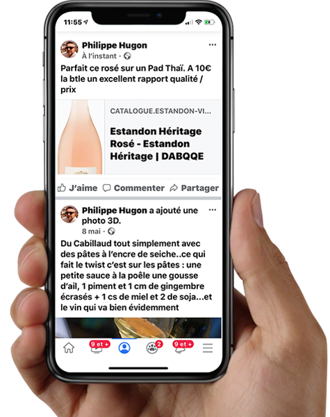 Avec l'application Fan Page Facebook, vous ajoutez à votre fan page sur desktop un onglet Nos Vins. Celui-ci présente l'ensemble des vins de la marque de votre choix. Vos fans pourront ainsi consulter votre catalogue produit à tout moment sans avoir à quitter Facebook et partager facilement vos fiches vin sur leur propre fil d'actu.