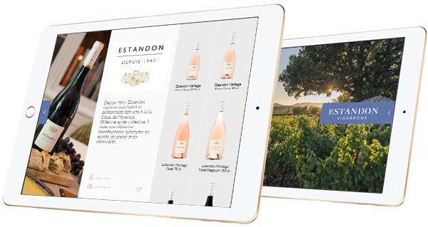 L'application Estandon sur l'Apple iPad® a été conçue pour les commerciaux, les importateurs, les distributeurs et leurs forces de vente. En plus de la qualité de présentation, un des avantages de l'application est non seulement qu'elle se synchronise avec le compte vin.co mais surtout qe, une fois les données téléchargées, il n'y a plus besoin de connexion internet pour les consulter. Un atout majeur pour les commerciaux itinérants.